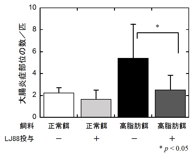 scindensを定着させたマウスに高脂肪食を与えることで惹起される大腸炎が、乳酸菌LJ88を併せて定着させることにより顕著に抑制されることもわかりました。