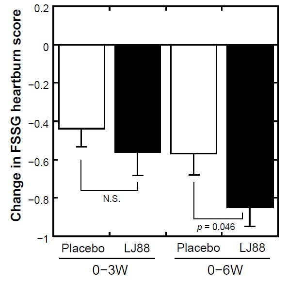 健常人ヒトボランティア120名に対し、乳酸菌LJ88殺菌体(10億個/日)またはプラセボを1日1回、6週間にわたり摂取さ せる条件で実施した、無作為プラセボ対照二重盲検並行群間比較試験において、乳酸菌LJ88殺菌体の摂取により、胸焼け症状が改 善することが確認されました。
